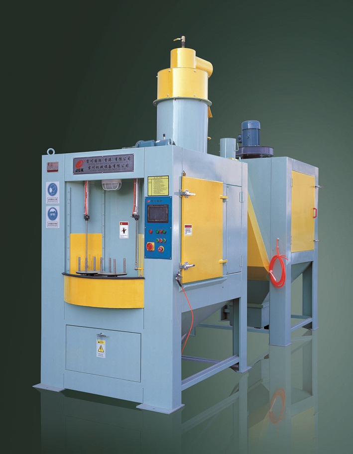 本設備是根據(jù)我公司針對轉(zhuǎn)動軸和處理要求而專門設計的轉(zhuǎn)盤式自動噴砂機,完全適合貴公司所提供的產(chǎn)品。根據(jù)貴公司對產(chǎn)品效率的要求,本機共大轉(zhuǎn)盤共設置4個區(qū)域(90度一個區(qū)域),每個區(qū)域設置2個工件裝夾工位。大轉(zhuǎn)盤每轉(zhuǎn)動90度區(qū)域一停,噴砂區(qū)域內(nèi)共布置12支普壓高速噴砂槍,在噴砂區(qū)1個區(qū)域 2個噴砂加工位,各布置6支噴砂槍對工件需噴砂部位做擺動噴砂加工,噴槍可根據(jù)加工需要,隨意調(diào)整其噴射角度,其自動化程度較高。 該機由主機、旋風分離器、除塵箱、抽風管道、空氣壓縮系統(tǒng)(客戶自備)、電氣系統(tǒng)等組成。本機配置12支普壓高速噴砂槍,根據(jù)工件的大小可擺動噴砂,也可定點噴砂,靈活方便實用。
